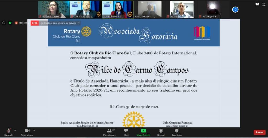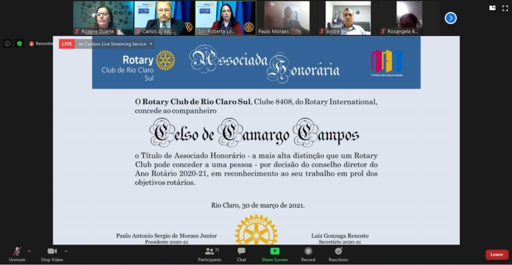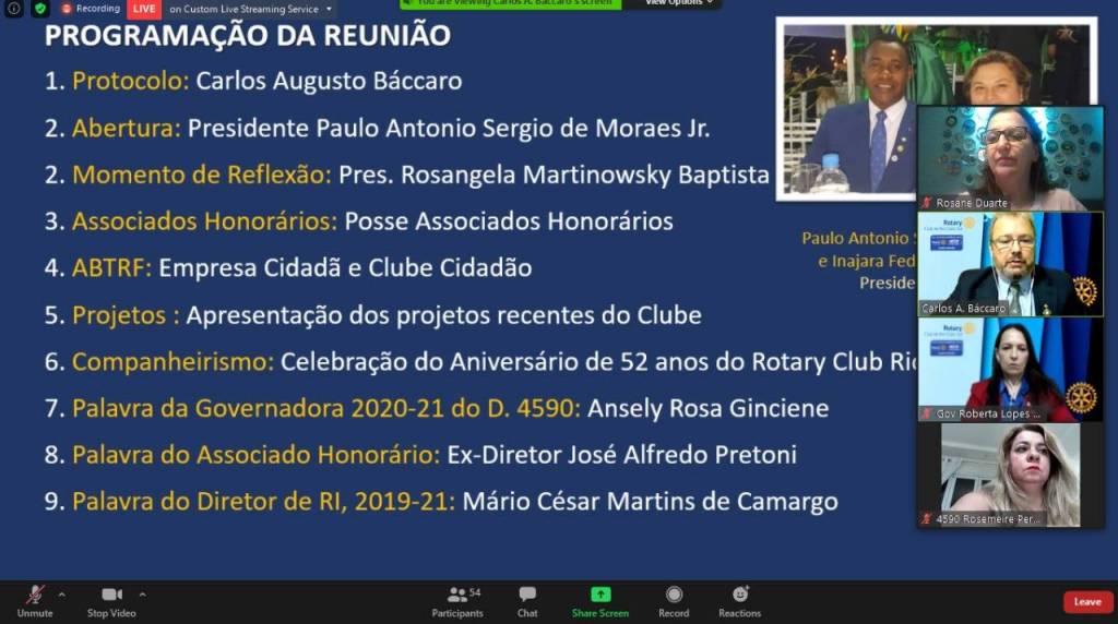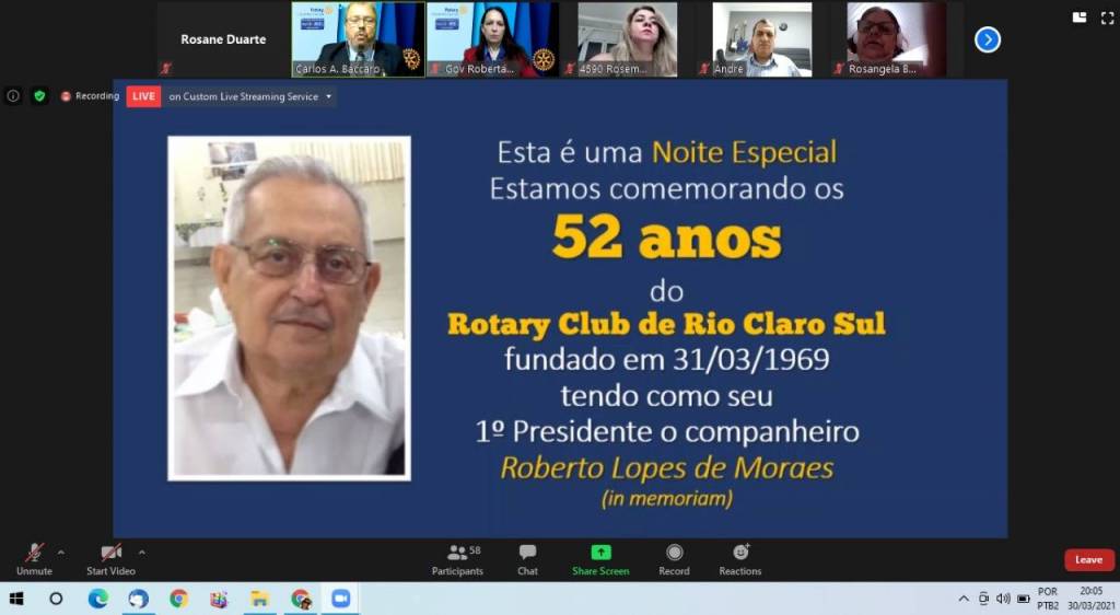 Reunião especial para celebração dos 52 anos do ROTARY CLUB CLUB DE RIO CLARO SUL e 50ª reunião virtual.