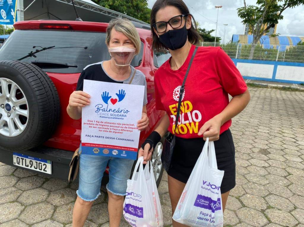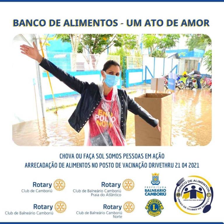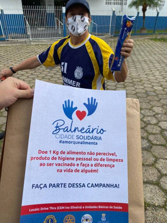 A Prefeitura de Balneário Camboriú e o Banco de Alimentos, uma integração entre os Lions Clubes e Rotarys Clubes da cidade, promovem a partir de sábado (17) a campanha "Balneário - Cidade Solidária". O objetivo é arrecadar, espontaneamente, das pessoas que estão recebendo a vacina contra o Coronavírus, alimentos não perecíveis, produtos de limpeza ou de higiene pessoal. A ação inicia às 8h, no drive-thru, ao lado do CEM Ivo Silveira, no bairro dos Estados, local que concentra a vacinação no final de semana.