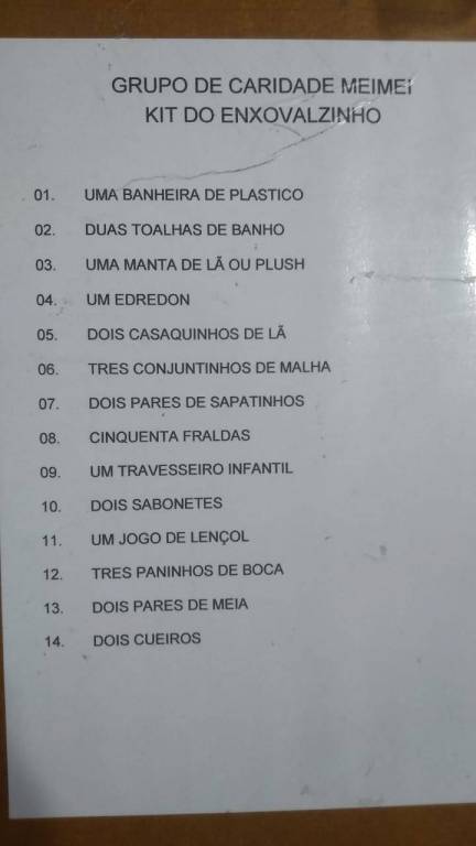 - Auxiliar o Grupo de Caridade Meimei na arrecadação de material e fundos para confecção dos kits de enxoval.
