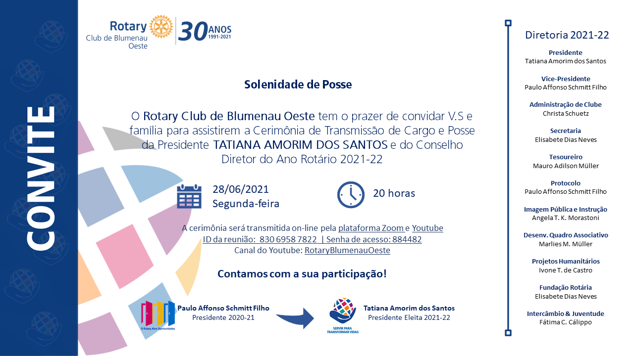 O Rotary Club Blumenau Oester, tem a honra de convidar V.S.ª. e família, para participar da reunião de transmissão de cargo e posse do presidente do ano rotário 2021-2022, a ser realizada no dia 28 de junho de 2021 às 20h.