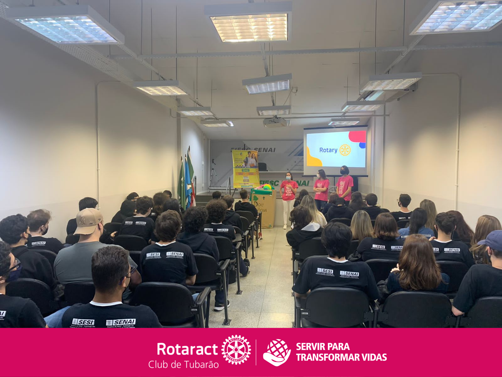 #paracegover As imagens mostram companheiros do Rotaract Club de Tubarão realizando uma apresentação sobre o clube para uma sala cheia de alunos do SESI/SENAI.