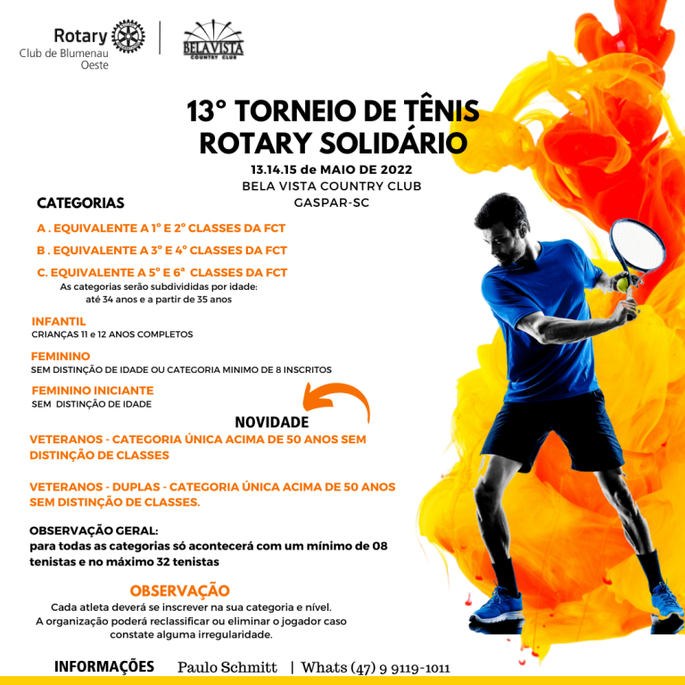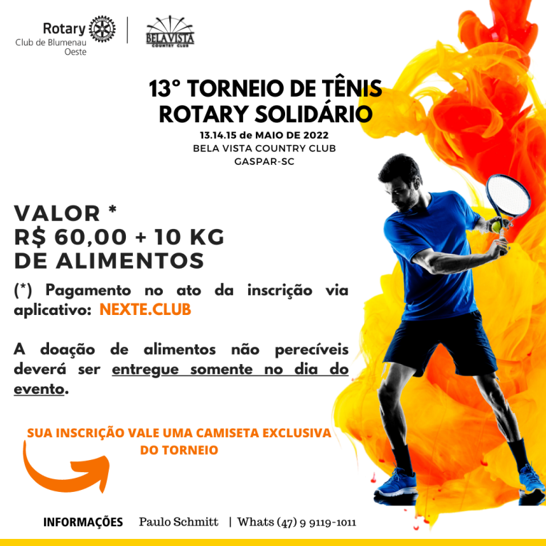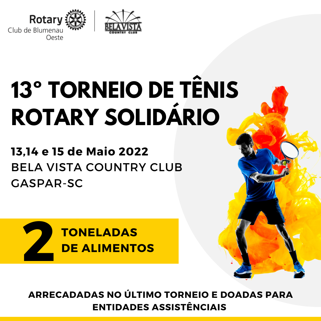 Acontece nos dia 13,14 e 15 de Maio de 2022, o tradicional Torneio de Tênis Rotary Solidário, no Bela Vista Country Club em Gaspar/SC.