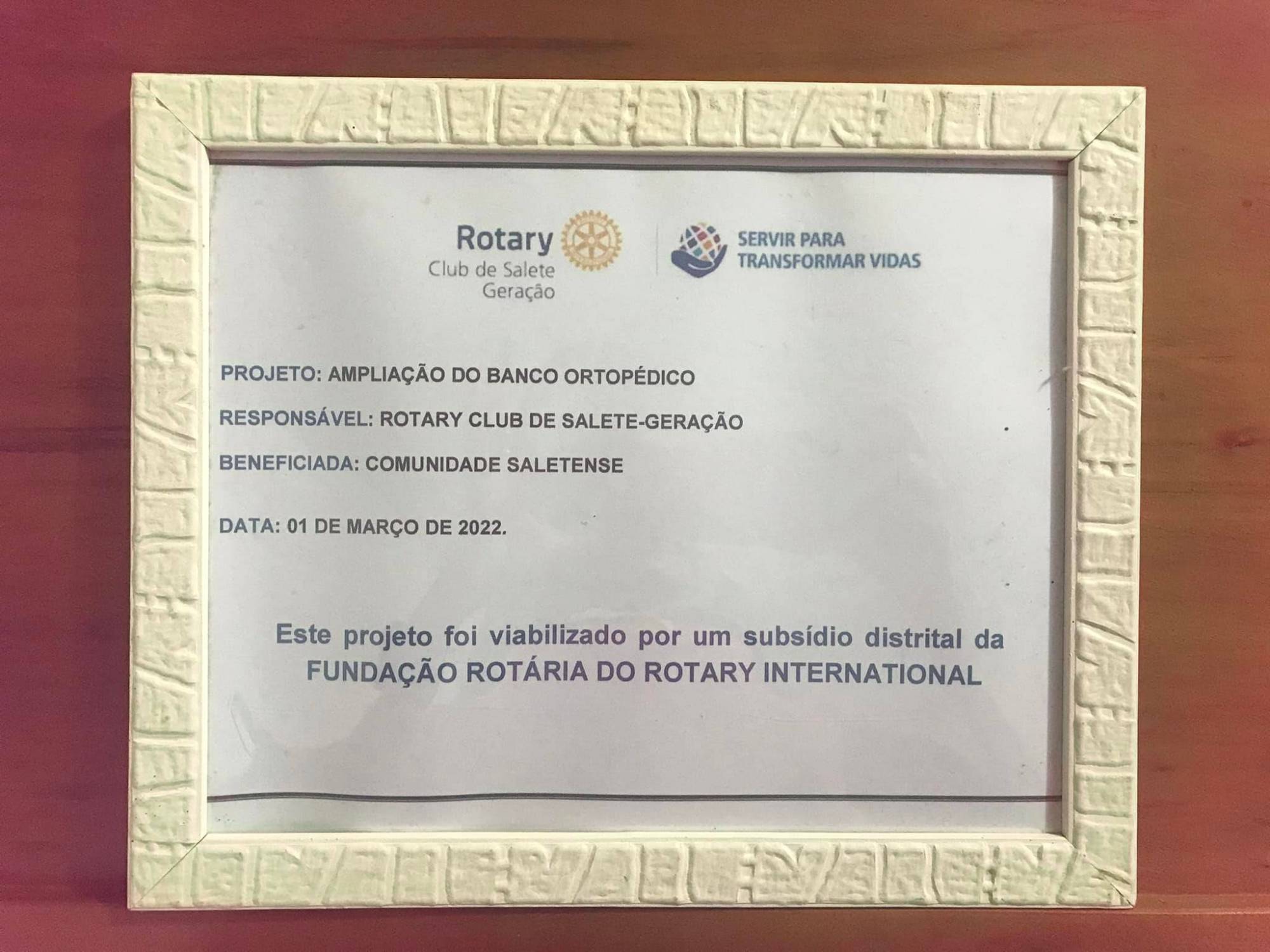 Com a necessidade de ampliar o banco ortopédico já existente no Rotary Club de Salete-Geração, o mesmo apresentou ao Distrito 4652 um pedido de Subsídio Distrital e foi contemplado mais uma vez.