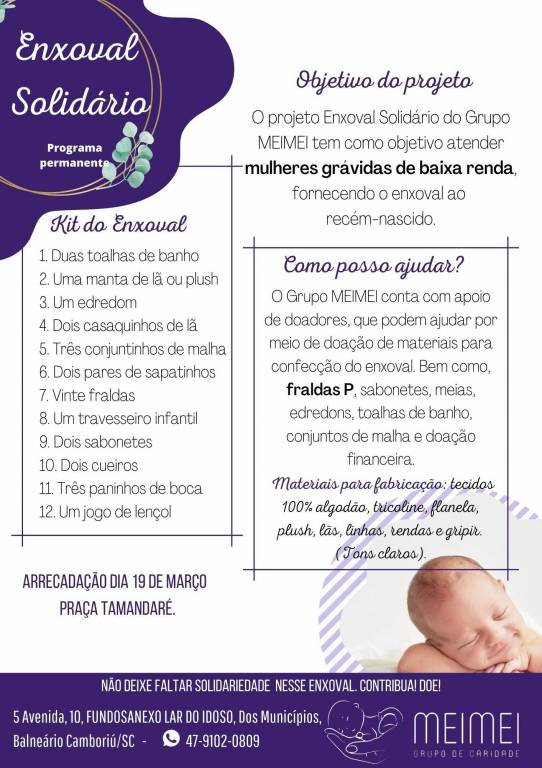 O projeto Enxoval Solidário do Grupo MEIMEI tem como objetivo atender mulheres grávidas de baixa renda, fornecendo o enxoval ao recém-nascido.