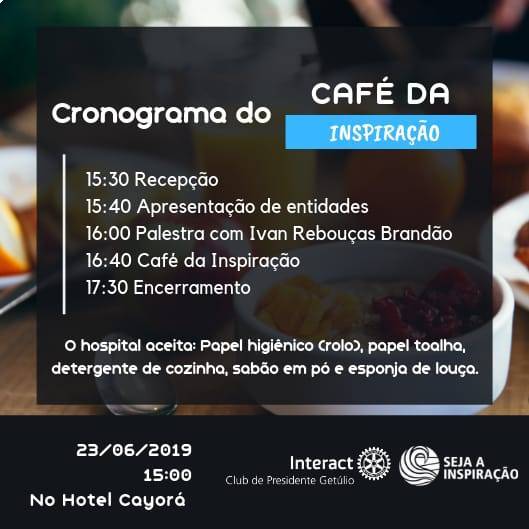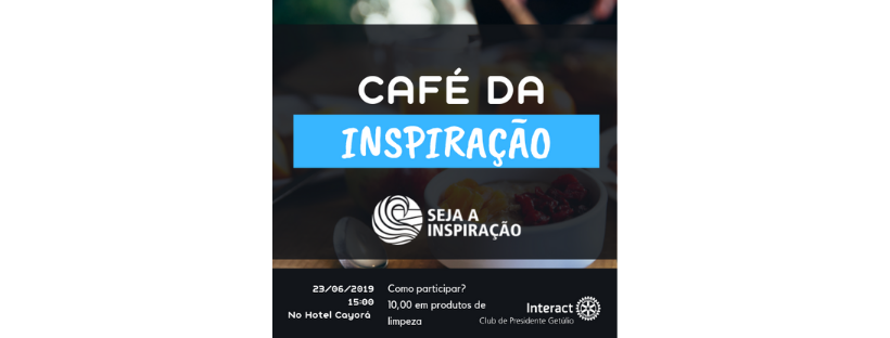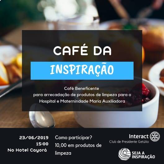 Nós do Interact Club de Presidente Getúlio, queremos convidar você para participar do Café da Inspiração que tem como objetivo arrecar produtos de limpeza para o Hospital e Maternidade Maria Auxiliadora. Para participar é muito fácil, basta comparecer às 15:00 no Hotel Cayorá em Presidente Getúlio e levar 10,00 em produtos de limpeza para colaborar com essa causa. O Café da Inspiração é um projeto Distrital de Área, cuja todos os clubes da Área 2 realizam um café beneficente para ajudar ou arrecadar tal coisa para alguma entidade. Caso compareça, confirme sua presença até dia 19/06 através das redes sociais do Interact Club de Presidente Getúlio ou pelo Whatsapp 991228602. Venha participar do Café da Inspiração!