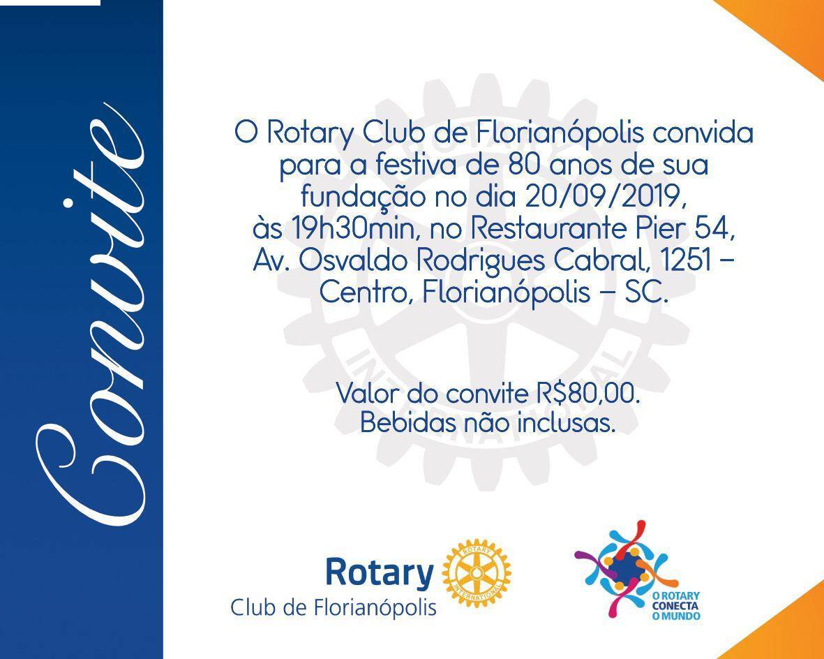 No dia 20/09/2019, às 19h30min, no Restaurante Pier 54, acontecerá a festiva em comemoração aos 80 anos do nosso Clube. O RC de Florianópolis é o Clube de Rotary mais antigo da região e o segundo mais antigo de Santa Catarina. Venha comemorar conosco e conhecer os projetos do Rotary. Convites pelo whatsapp (48) 999801100.