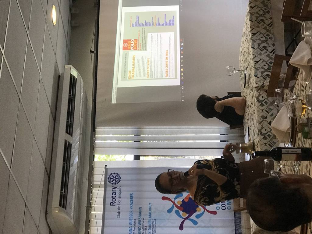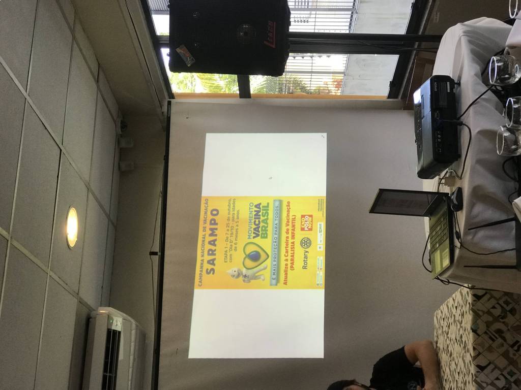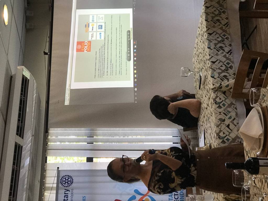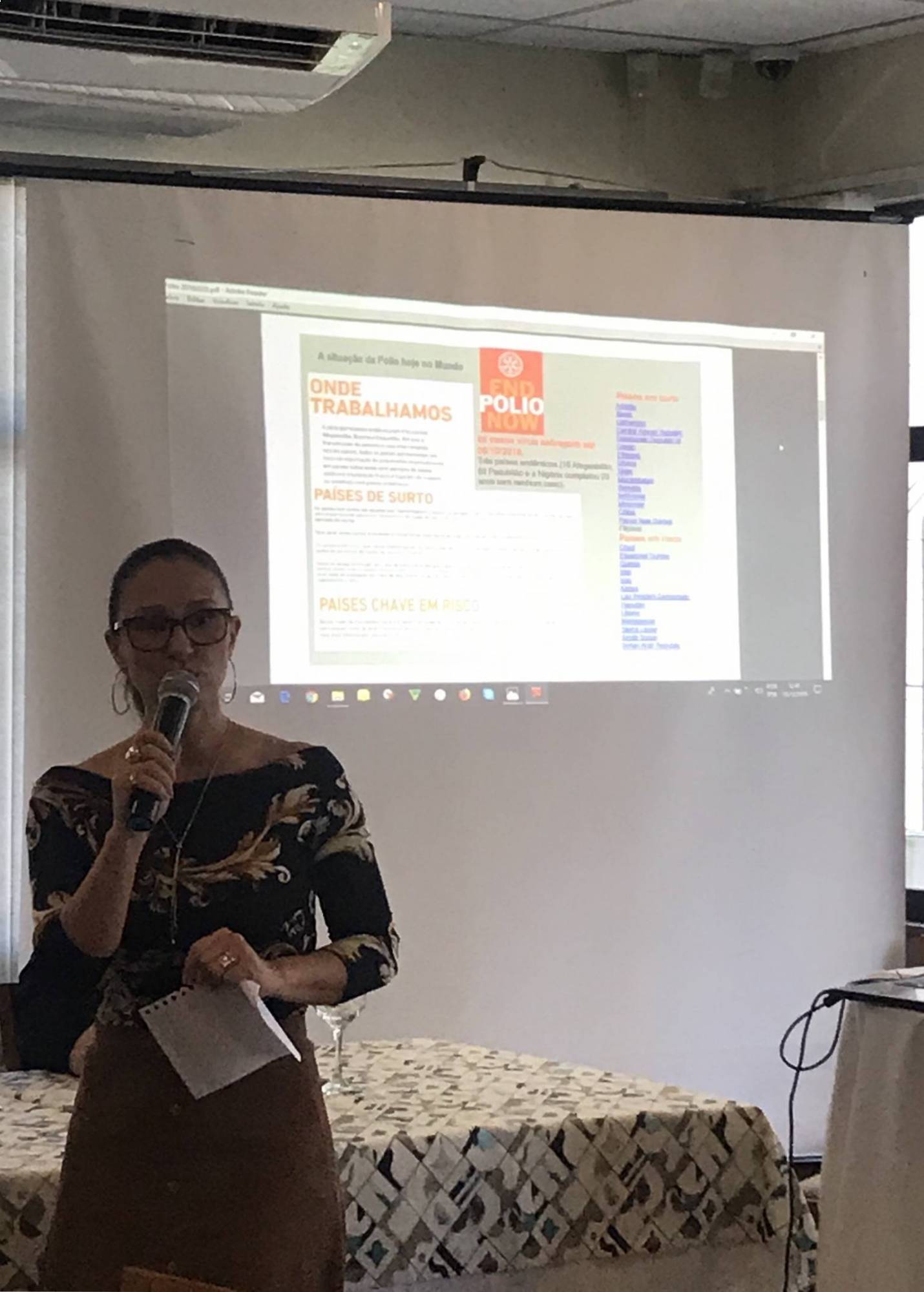 Em seguida, a companheira presidente apresentou um relato com dados estatísticos da área da Saúde Pública, sobre a paralisia infantil ressaltando as diversas campanhas de vacinação deflagradas pelo Rotary Internacional, para a vacinação de combate à enfermidade, iniciada no ano de 1979. Salientou a importância da conscientização de todos para divulgar a vacinação objetivando a erradicação da polio e que o dia 24 de outubro é o dia Mundial de Combate à Poliomielite.