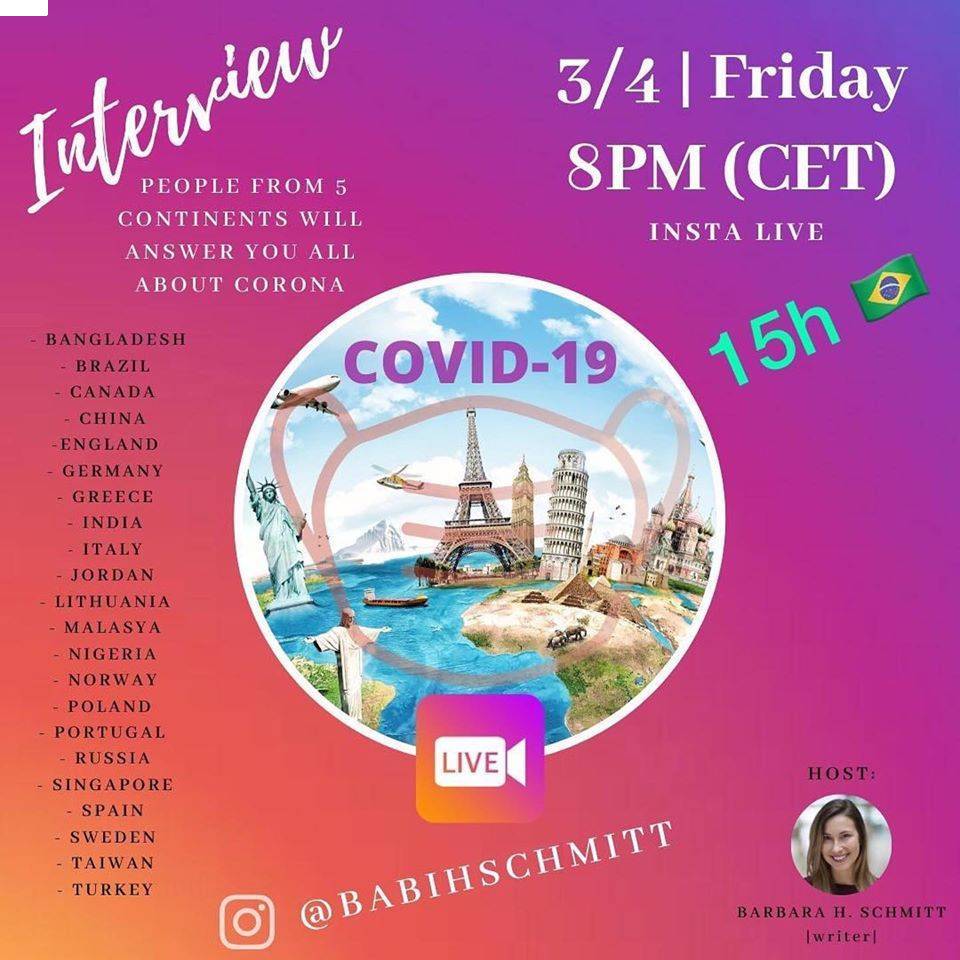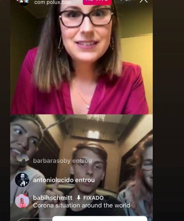 Dia 03.04.20 aconteceu uma “live” com intercambistas dos 5 Continentes, falando sobre a situação, as perspectivas e os anseios de cada região/país em que se encontram. Participaram com suas experiencias intercambistas de 26 países dos cinco continentes perguntando sobre o coronavírus em cada um destes lugares e isto durou mais de 5 horas com a participação de mais de 200 pessoas no Instagram.