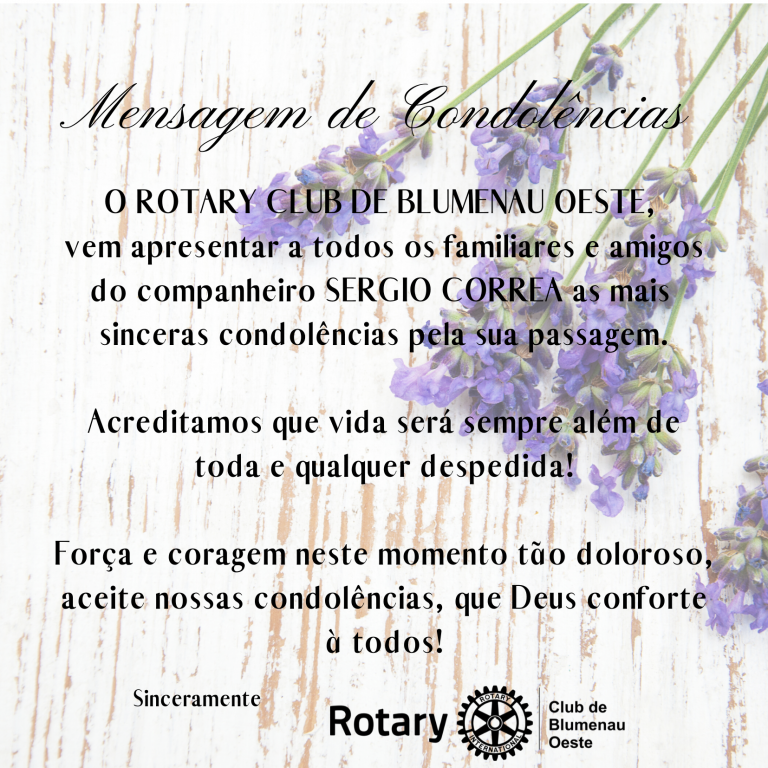 O Rotary Club de Blumenau Oeste vem prestar uma singela homenagem ao EGD o Companheiro Sergio Correa (2006-2007) acontecido na data de hoje em Blumenau