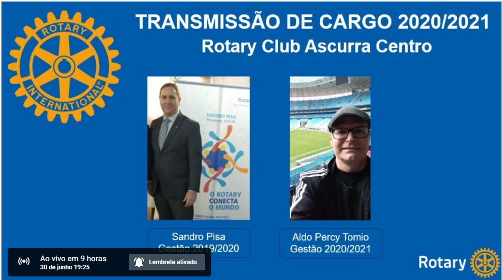 O ROTARY CLUB DE ASCURRA CENTRO transmitirá a reunião de transferência de cargos da direotira eleita para o ano Rotário de 2020/2021 no link abaixo:
