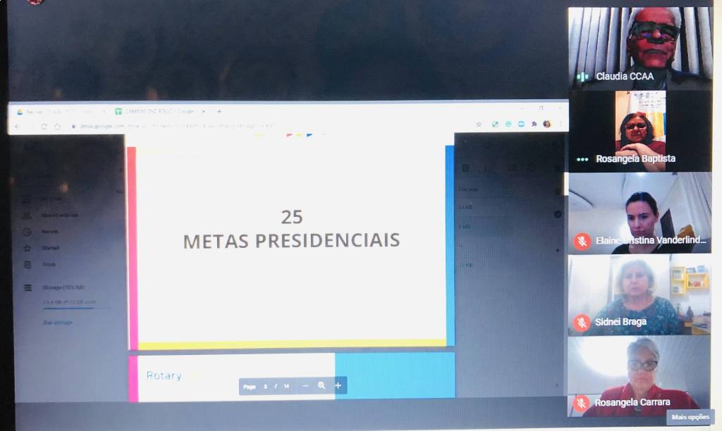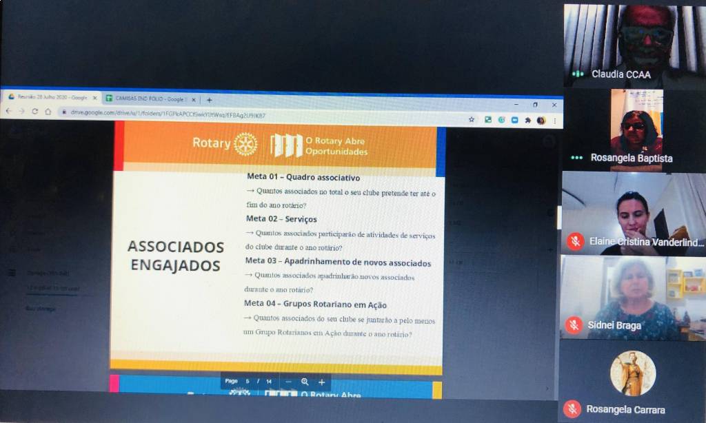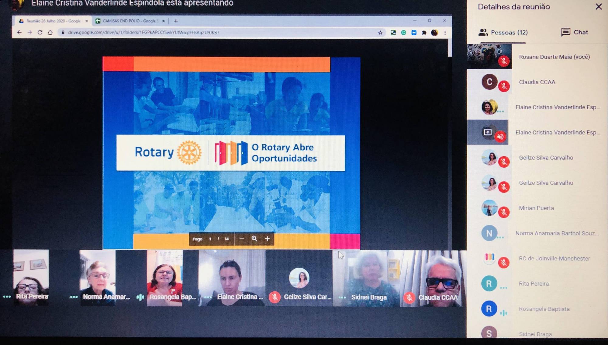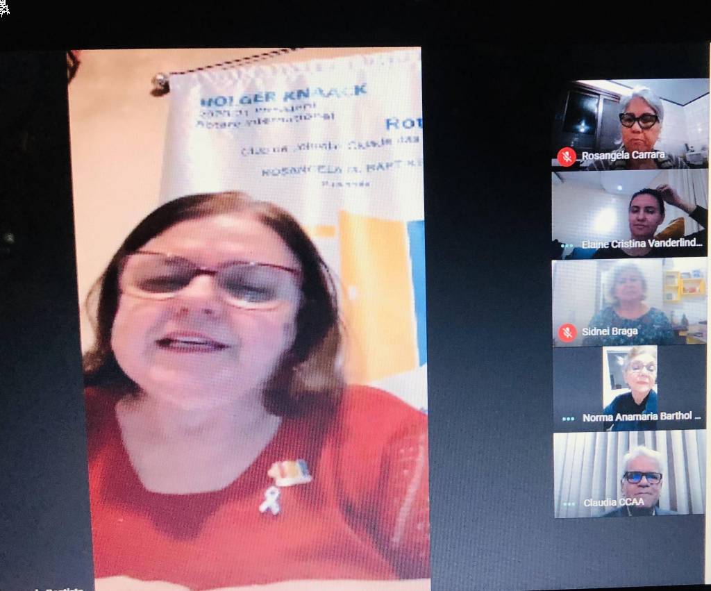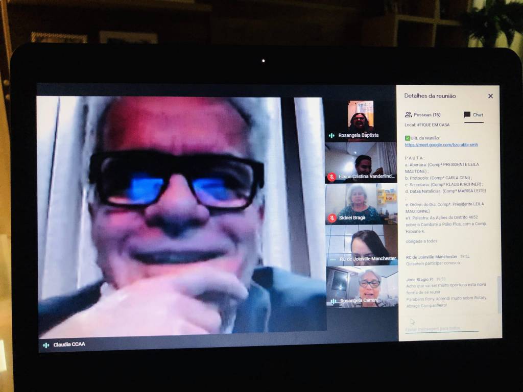 O Rotary Club de Joinville Cidade das Flores realizou nesta terça-feira sua quarta reunião online com a participação de 12 associadas e 05 visitantes, sendo eles: Dalci Silveira - Rotary Club Manchester, Rosângela Carrara - Rotary Club Garuva, Thiago Dias -Rotary Club de Joinville Pirabeiraba, Marcelo Esteves – Rotary Club Joinville e a participação especial do Governador Assistente companheiro Ronny Janssens – também do Rotary Club Joinville. A reunião teve inicio com a palavra da Presidente Rosângela Baptista. O protocolo ficou por conta da companheira Rita Pereira e a Instrução Rotária realizada pela companheira Dirley Sanches com a leitura de texto sobre o lema rotário: “Dar de si, sem pensar em si”. Em seguida o companheiro Ronny Jassens – Governador Assistente foi convidado para um bate papo sobre sua trajetória no Rotary, falou também das diretrizes e metas ano rotário 2020-2021.