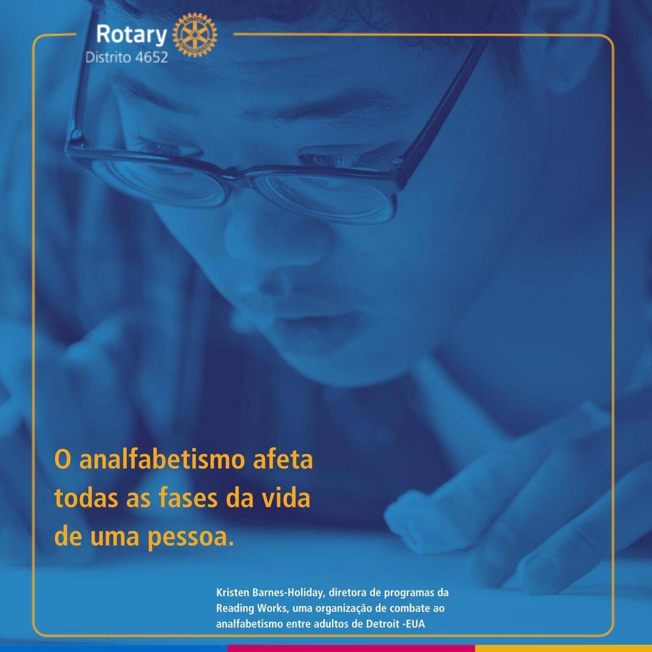 Aqueles que não sabem ler ou escrever são muito mais propensos a continuarem na pobreza, terem problemas de saúde e viverem isolados em um mundo cada vez mais dependente da utilização de computadores" Kristen Barnes-Holiday, diretora de programas da Reading Works, uma organização de combate ao analfabetismo entre adultos de Detroit -EUA - Parceira do Rotary International.