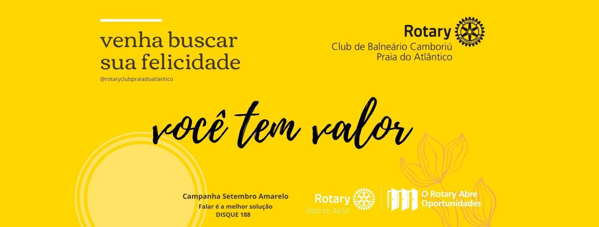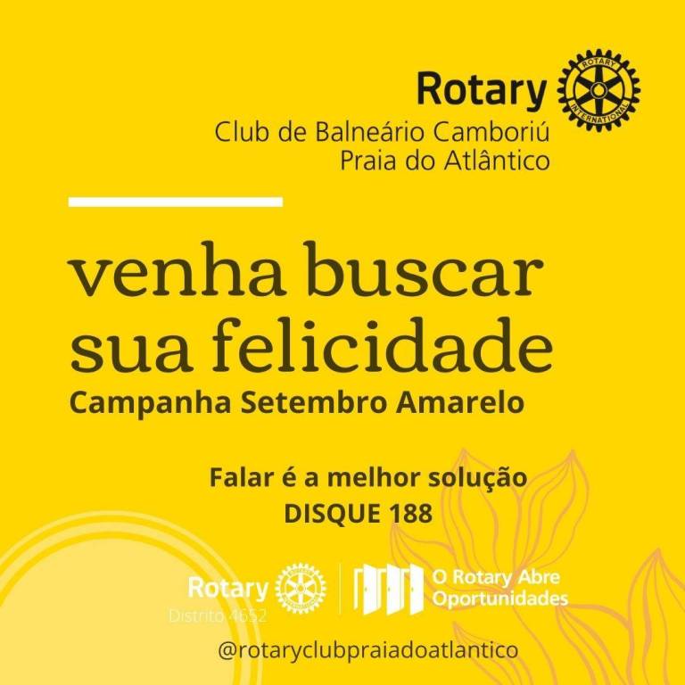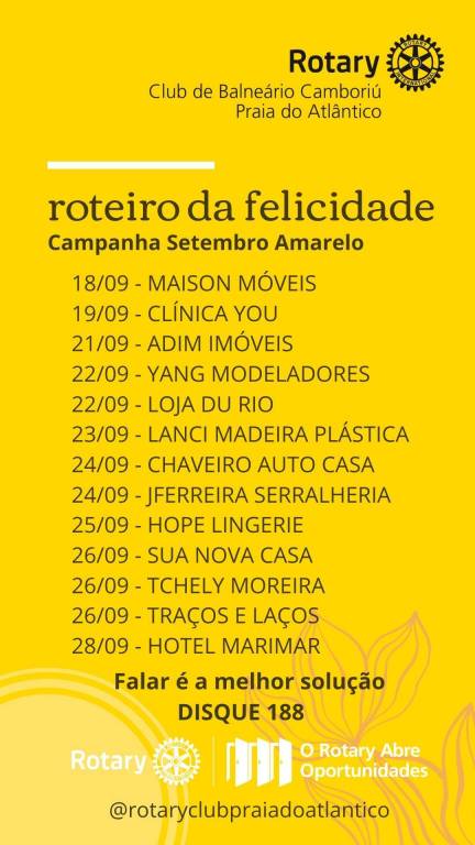 O Rotary Club de Balneário Camboriú Praia do Atlântico realizou na semana de 18 a 28 de setembro de 2020 o ROTEIRO DA FELICIDADE, uma ação em celebração ao Setembro Amarelo em prol da valorização da vida.