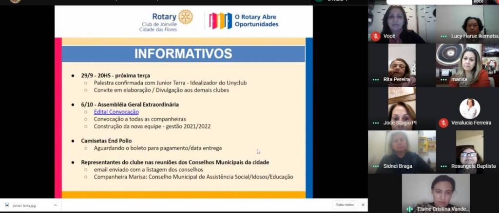 O Rotary Club de Joinville Cidade das Flores proporcionou neste última terça-feira palestra online de importante valia. O palestrante Júnior Terra idealizador do UnyClub falou do mecanismo,funcionalidades da plataforma online e sua importancia para o Rotary. Estiveram presentes 42 pessoas, entre associadas e visitantes de Clubes da região.