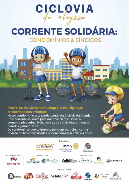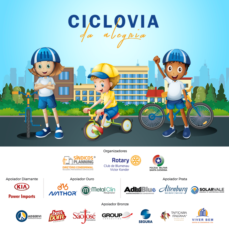 A Inspiracom Marketing e Comunicação e Síndicos Planning, o Rotary Club Blumenau Victor Konder e o 10º Batalhão da PM de Blumenau integram a comissão organizadora do projeto Ciclovia da Alegria e contam com o importante apoio das seguintes empresas: Kia Power Imports, Nathor Bicicletas, Metal Clin Hospitalar, ADMBlue Adminstradora de Condomínos, Altenburg, Autotec Vistorias, Solar Vale, Adservi, Bem Bom Salgados, Cemitério São José, Group Consultoria, Grupo Segura, Olho Embutidos, Tapeçaria Italiana, Viver Bem Condomínios
