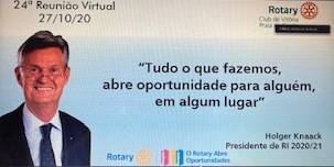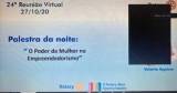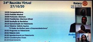 Os novos tempos vem trazendo ao longo do ano inusitadas formas de reuniões online. Estreitando relações simultaneamente entre os Distritos 4652 e 4751, reuniram os Companheiros do Rotary Club de Vitória Praia do Canto,juntamente com os Companheiros do Rotary Club de Vitória, Rotary Club de Vitória Praia Comprida, Rotary Club de Aracruz e o Rotary Club de Joinville Cidade das Flores. A reunião foi de grande valia com a preciosa contribuição da Empreendedora Valéria Aquino, palestrando sobre o tema: "O poder da Mulher para o Empreendedorismo".