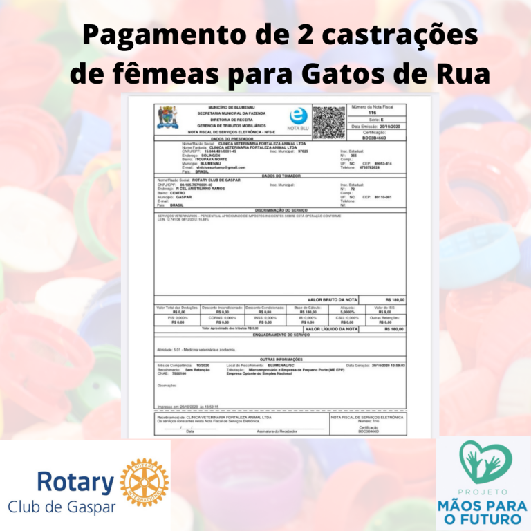 * R$ 180,00 – Pagamento de 2 castrações de fêmeas para o projeto Gatos de Rua - Blumenau